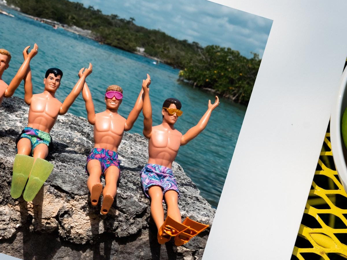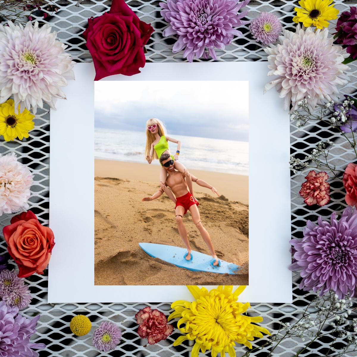 Ride the waves of fun with this fine art photograph of custom dolls surfing together on a vibrant surfboard. With matching sunglasses and joyful expressions, they capture the essence of adventure and summer excitement. This print brings energy and color to any space.