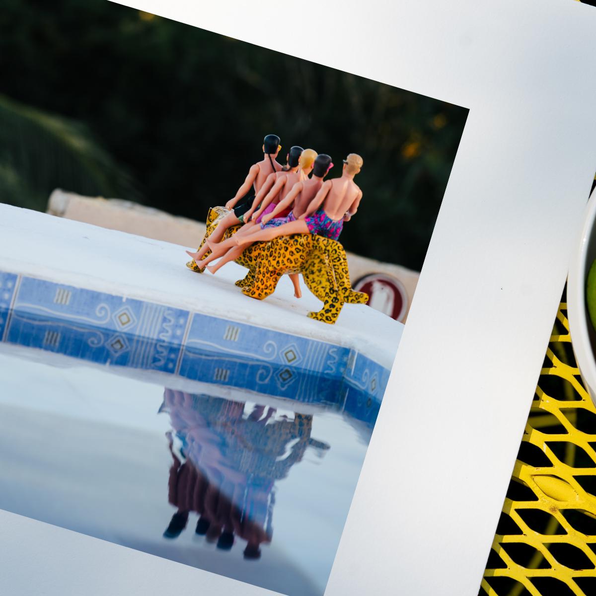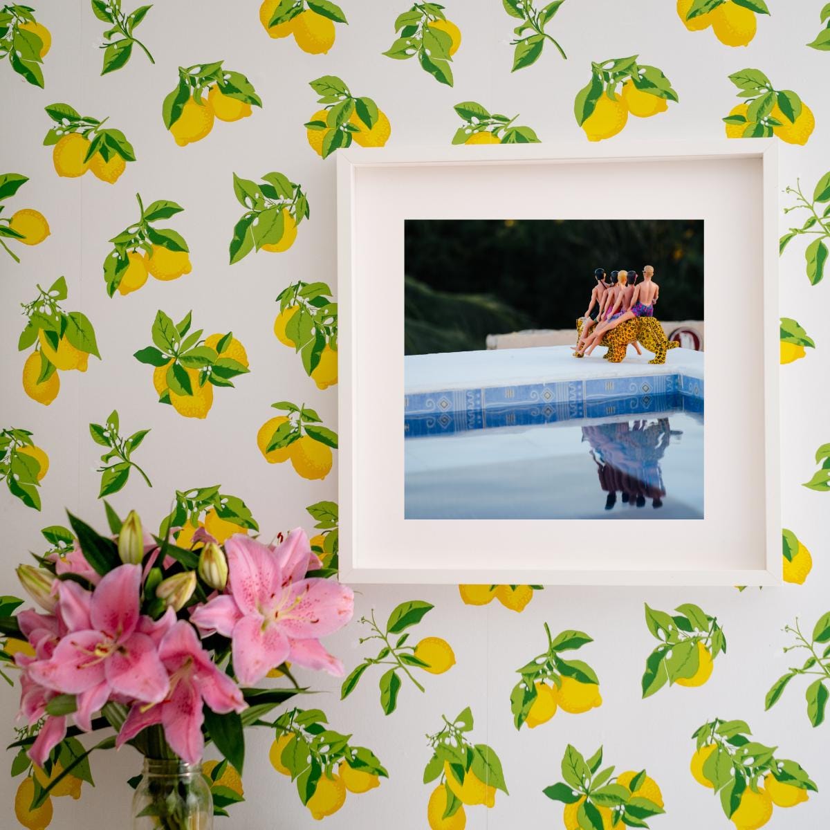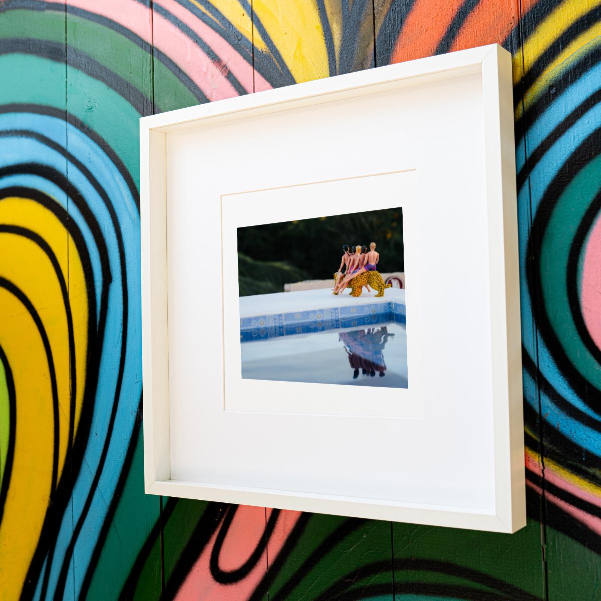 The boys are taking over the resort—literally—lounging atop a colorful ceramic jaguar in their most fabulous swimwear and funky shades. This bold, humorous print makes a fun statement for collectors of retro kitsch and fans of iconic boy bands with attitude.